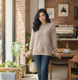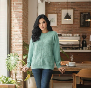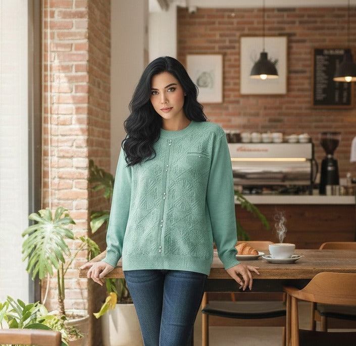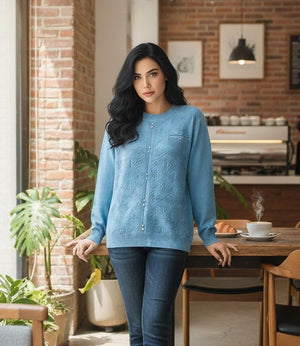 Azure Lattice Textured Knit Top This expertly designed knit top showcases a distinctive lattice weave that creates dimensional texture and visual interest. The cool azure colorway offers versatility across multiple seasons and styling occasions. Constructed from quality knit fabric, it delivers a refined silhouette with enough structure to maintain its shape while providing comfortable wear throughout the day. The intricate lattice pattern elevates the piece beyond basic basics, making it a thoughtful addition to a curated wardrobe. Ideal for layering or wearing as a standalone top with tailored bottoms or casual denim.