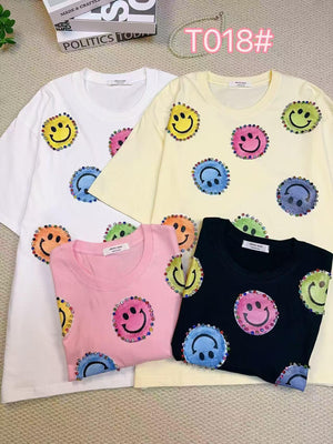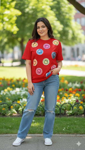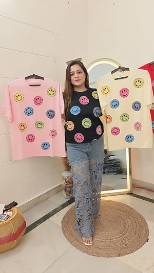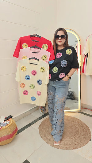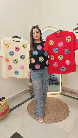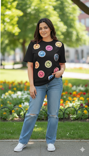 Upgrade your t-shirt game with our Beaded Smiley Vibes Tees. The beaded smiley face adds a touch of fun and positivity to any outfit. Made with quality materials, these tees are comfortable and durable. Spread happiness and style with our Beaded Smiley Vibes Tees.