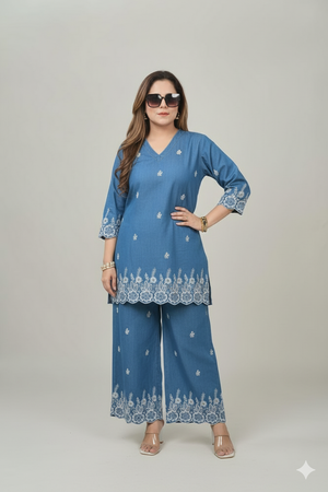 Blue Blossom Denim Co-ord Set – Elegant Embroidered Two-Piece