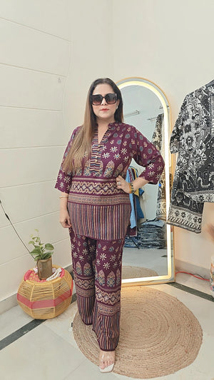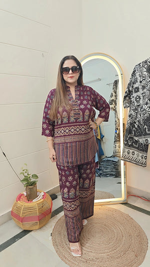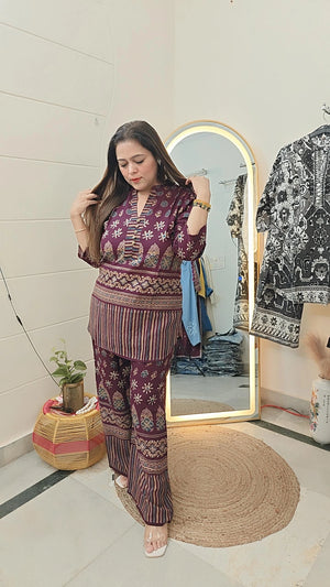 This "Boho Bloom Kurta-Pant Set" in Deep Wine features a comfortable and stylish Cordset design. Made from high-quality materials, this set guarantees a perfect fit and long-lasting wear. Enjoy an elegant and chic look with this beautiful set, perfect for any occasion. Upgrade your wardrobe with this must-have piece.