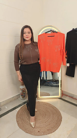 This Bow Sparkle Embellished Full Sleeve Top is a sophisticated and stylish addition to any wardrobe. Its top design features full sleeves and sparkling embellishments, perfect for adding a touch of glam to any outfit. Crafted with high-quality materials, this top is both comfortable and versatile, making it a must-have for any fashion-forward individual.