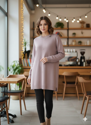 Elevate your winter wardrobe with this sophisticated knit sweater, featuring a charming bow neckline and functional button detailing. Crafted from quality knit fabric, this long-length top offers both comfort and refined style. The bow accent at the neck adds a distinctive touch, making it perfect for layering or wearing solo. Ideal for creating polished, effortless looks that transition seamlessly from casual to semi-formal occasions.