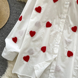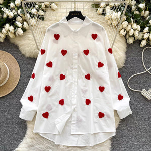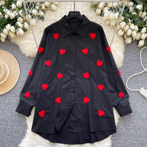 This chic button-up shirt features a vibrant red heart embroidery, adding a touch of elegance and personality. Made with high-quality materials, this shirt offers both style and comfort, making it a versatile and fashionable addition to any wardrobe. Don't compromise on style or quality with this must-have piece.
