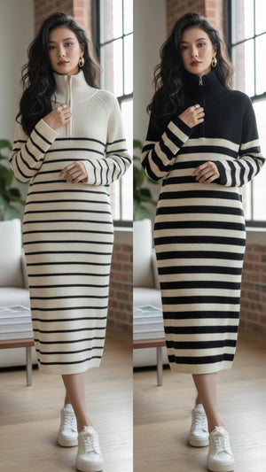 Stay stylish and cozy this winter with our Chic Winter Stripes Midi Dress. Made with high-quality materials, this dress offers both comfort and fashion. The elegant midi length and trendy stripes add a touch of sophistication to any outfit. Perfect for any occasion, this dress is a must-have in your winter wardrobe.