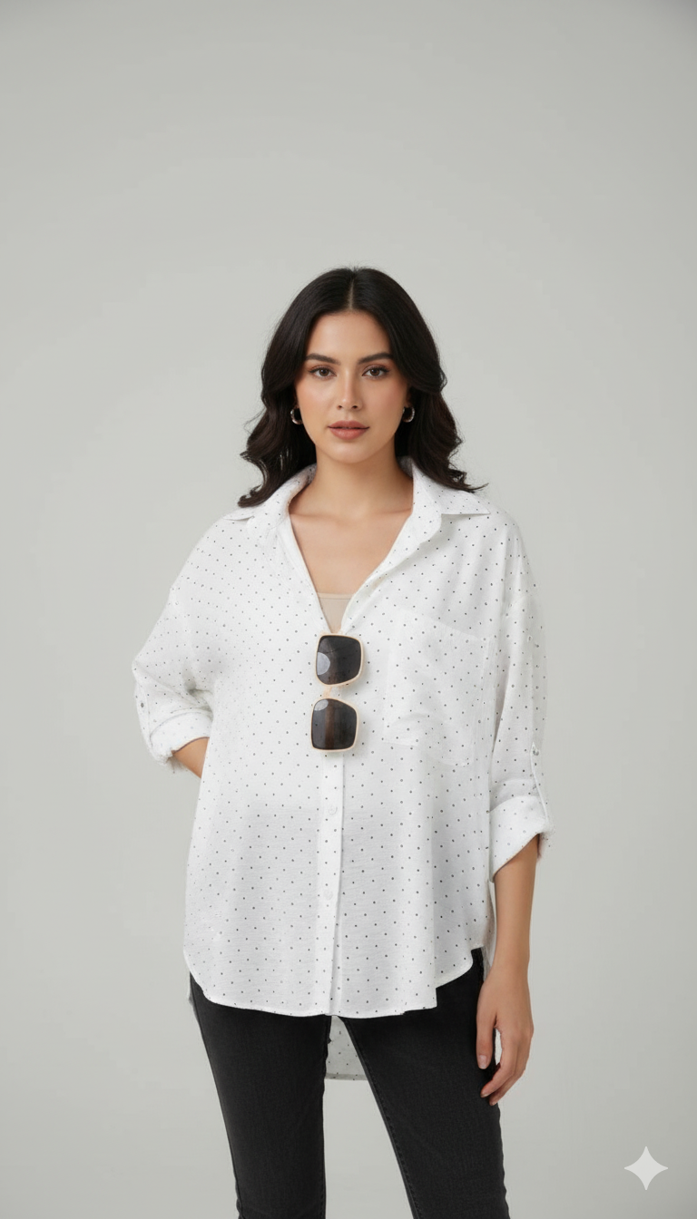 Expertly crafted from high-quality cotton, this classic polka dot oversized shirt is a must-have for any wardrobe. Its versatile design effortlessly blends style and comfort. Elevate your look with this timeless piece that offers the perfect balance of sophistication and ease.