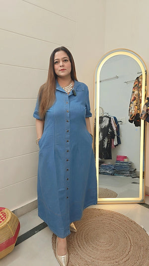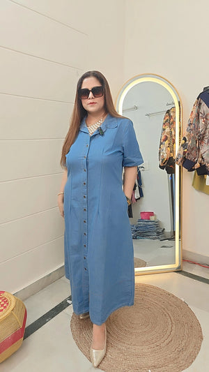 "The Classic Denim Shirt Dress is a versatile addition to any wardrobe. Made with durable denim, this dress offers a timeless look that can be dressed up or down. The high-quality fabric ensures long-lasting wear and comfort, making it a practical and stylish choice for any occasion."