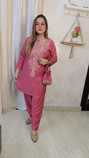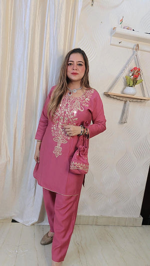 Experience elegance and comfort with our Cord Set With Potli. Made of high-quality, soft cotton silk fabric, this set features a beautifully embroidered design that will make you stand out. Available in sizes 40-46 and a length of 33 for the top and 39 for the bottom. Order now at a rate of 1299, plus shipping. Ready to be shipped!