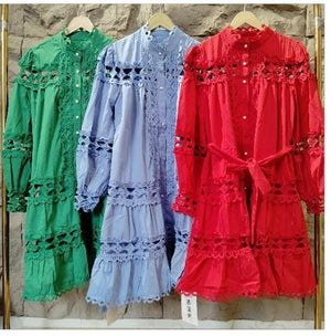 Crafted from 100% cotton, this crochet dress combines style and comfort. The delicate crochet design adds a touch of elegance, making it perfect for any occasion. Breathable and lightweight, this dress is a must-have for any wardrobe. Stay cool and fashionable in the summer with this timeless piece.