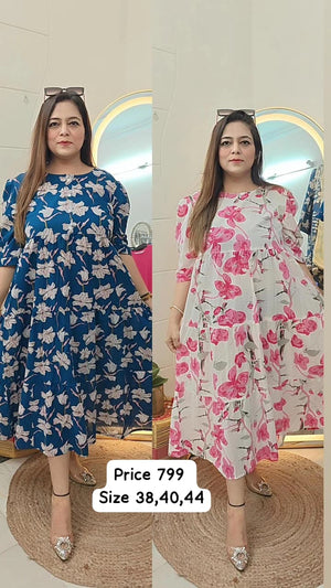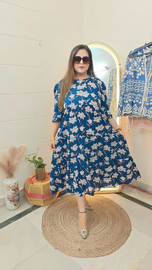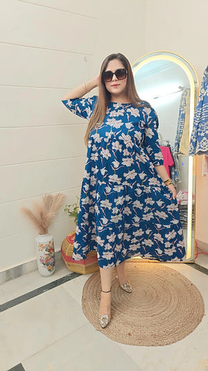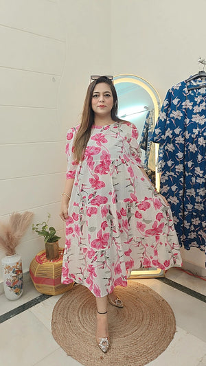 This cotton floral A line dress is the perfect addition to any wardrobe. The beautiful floral pattern adds a touch of elegance while the A line cut offers a flattering fit for all body types. Made with high quality cotton, this dress is comfortable and stylish. Perfect for any occasion.