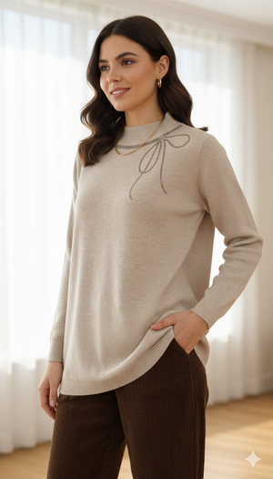Elevate your winter wardrobe with this Crystal Bow Cozy Long Sweater Top, a sophisticated piece that seamlessly blends comfort with refined style. The delicate crystal bow detail adds an elegant focal point, while the extended length provides versatile layering options for various occasions. Crafted for warmth without bulk, this sweater top features a cozy knit construction that drapes beautifully. Perfect for creating polished casual looks or dressing up with tailored pieces, it's an investment piece that transitions effortlessly through seasons.
