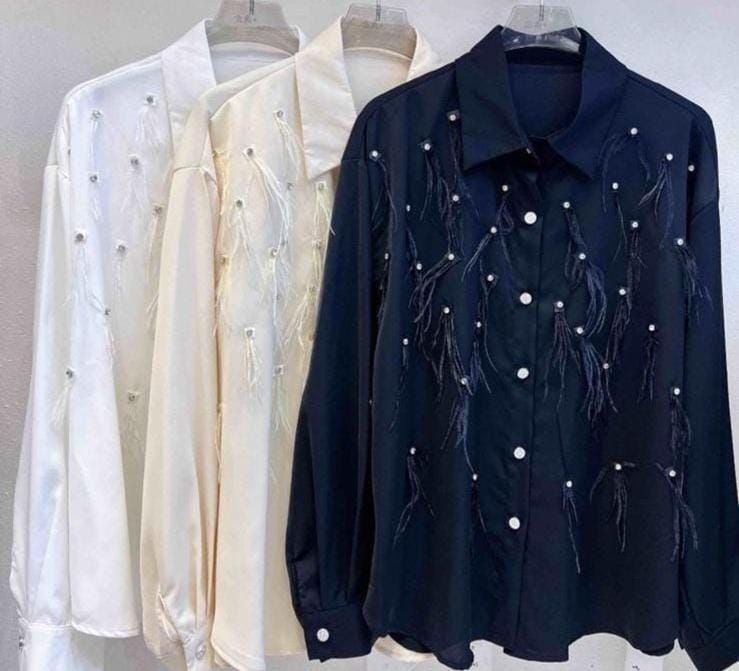 This designer pearl shirt features a unique combination of elegance and modern style. The addition of pearls and fringe adds a touch of sophistication, making it perfect for any formal occasion. With high-quality materials and attention to detail, this shirt is sure to elevate any outfit.