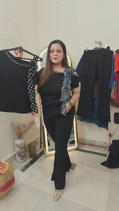 Enhance your wardrobe with our elegant black tee. The pearl embellishments add a touch of sophistication, while the polka-dot sash adds a fun and playful element. Perfect for both formal and casual occasions. Upgrade your style with this must-have top.