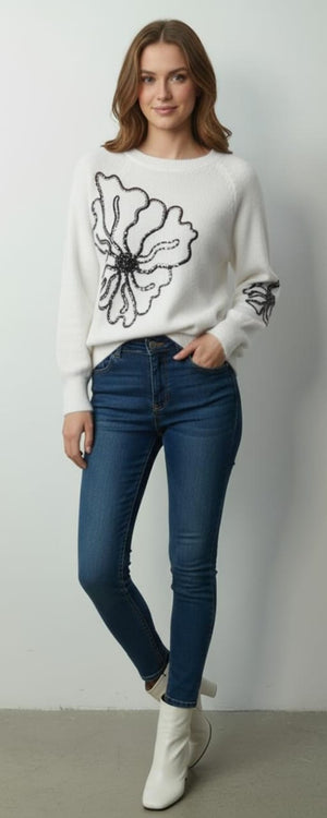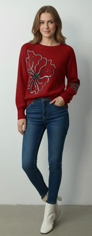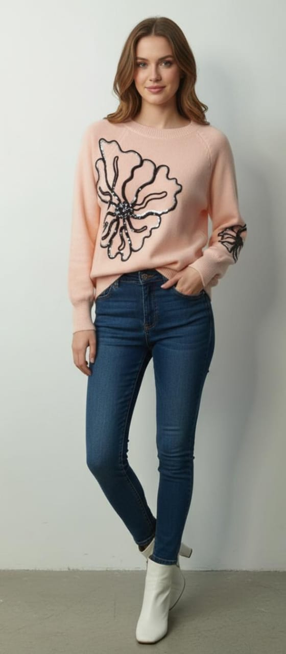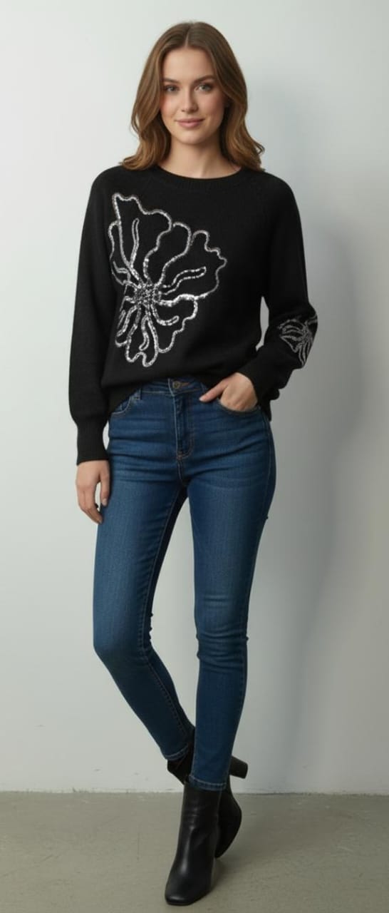 Add a touch of glamour to your wardrobe with our Elegant Bloom Sequence Sweater top. Made with exquisite sequence detailing, this top will catch the light and turn heads at any occasion. Elevate your style and confidence with this stunning addition to your collection.