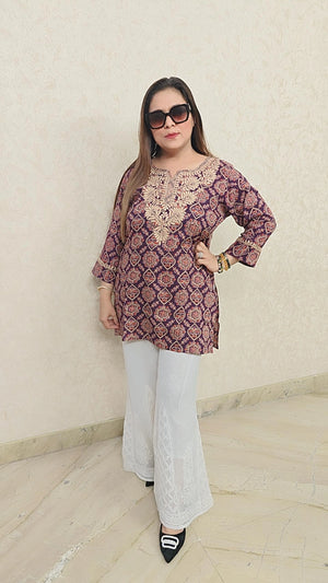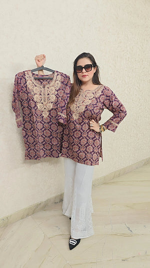Elegant purple Printed Short Kurti with Embroidery