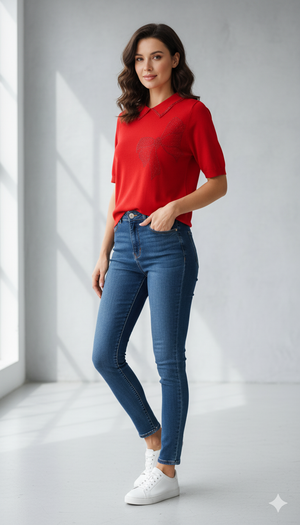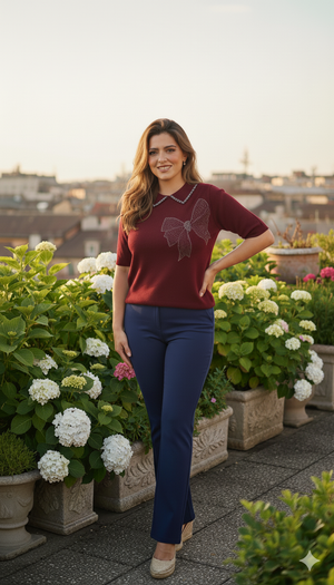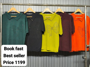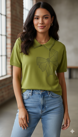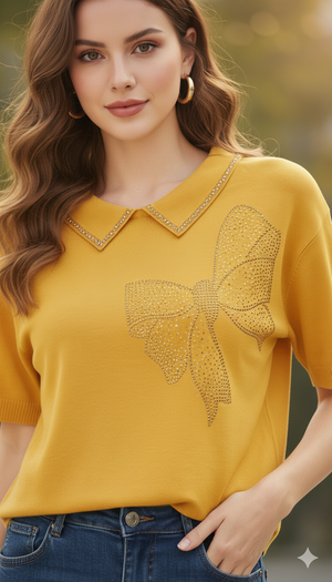 Expertly crafted with a sleek collared neckline and intricate embellishments, this knit top is the perfect addition to any wardrobe. Its classic design offers versatility, while the added details bring a touch of elegance. Made with quality materials, this top is comfortable and stylish for any occasion.