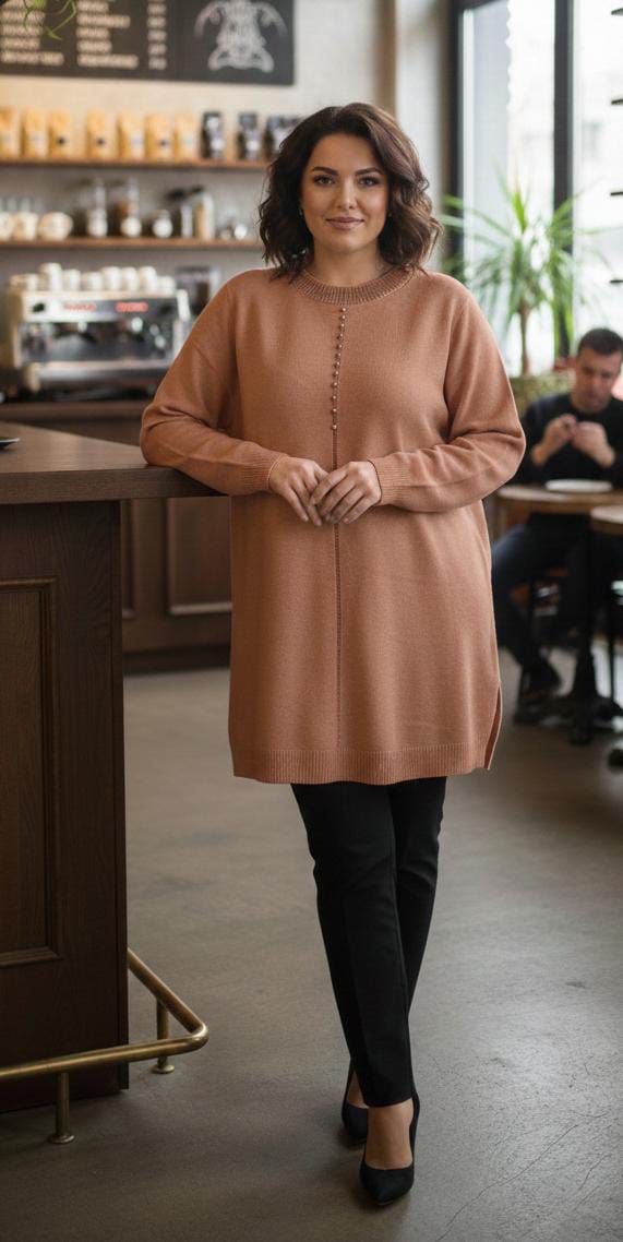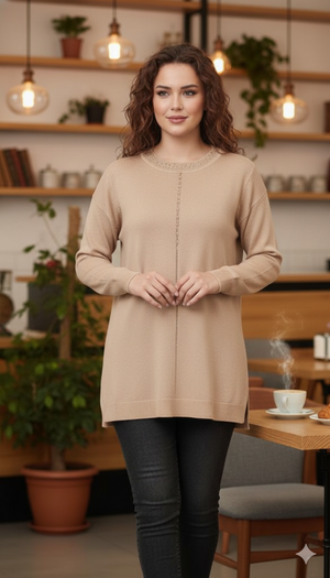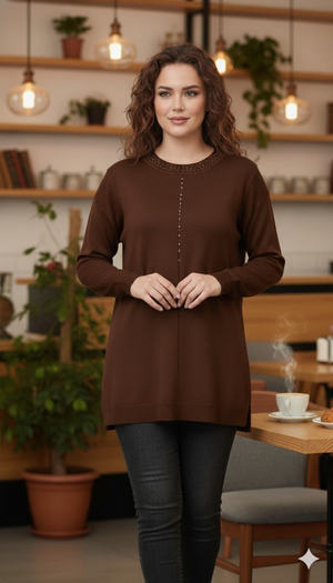 Elevate your everyday wardrobe with this sophisticated embellished tunic sweater, expertly crafted to deliver both style and comfort. The intricate beaded detailing adds a refined touch, transforming a classic silhouette into a statement piece perfect for layering or wearing solo. The generous tunic length provides flattering coverage while the quality construction ensures durability through countless wears. Ideal for transitional seasons, this versatile long top pairs effortlessly with jeans, leggings, or tailored trousers, making it an essential addition to any discerning wardrobe.