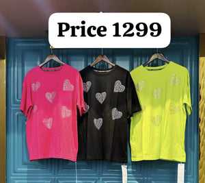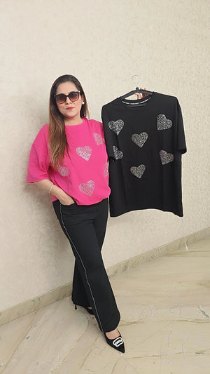 Step out in style with our Glitter Hearts Statement T-Shirt. The perfect addition to any wardrobe, this t-shirt features glitter hearts that will add a touch of sparkle to your outfit. Made with high-quality materials and designed to be comfortable and stylish, this t-shirt is a must-have for any fashion-forward individual.
