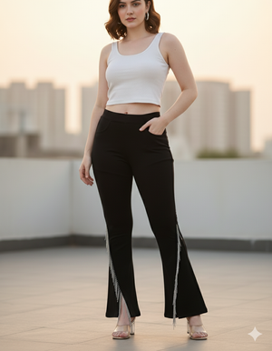These high-waist flared pants are a stylish addition to your wardrobe. Made with a comfortable fit, they feature a crystal fringe slit that adds a touch of glamour. Perfect for any occasion, these pants offer both style and comfort.