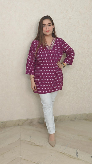 Update your wardrobe with this effortlessly stylish Maroon Printed Kurta. The intricate embellished neckline adds a touch of elegance to this piece, making it perfect for any occasion. The rich maroon color and eye-catching print will make you stand out while feeling comfortable and confident.