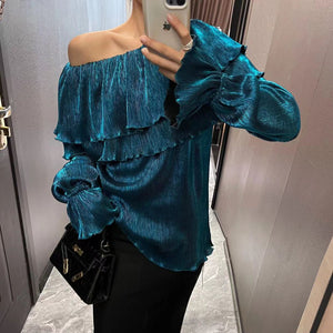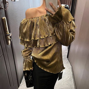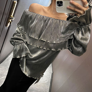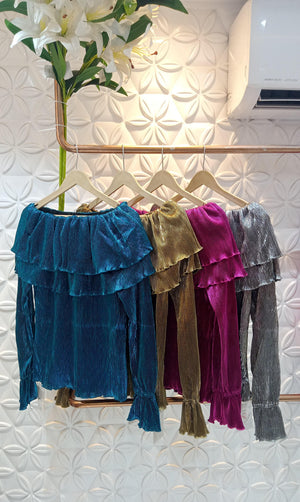 Introducing our Metallic Pleated Top - perfect for any party! This free size top features a stunning metallic finish and pleated design, giving you a sophisticated and elegant look. Transform your outfit and make a statement with our versatile and chic top.