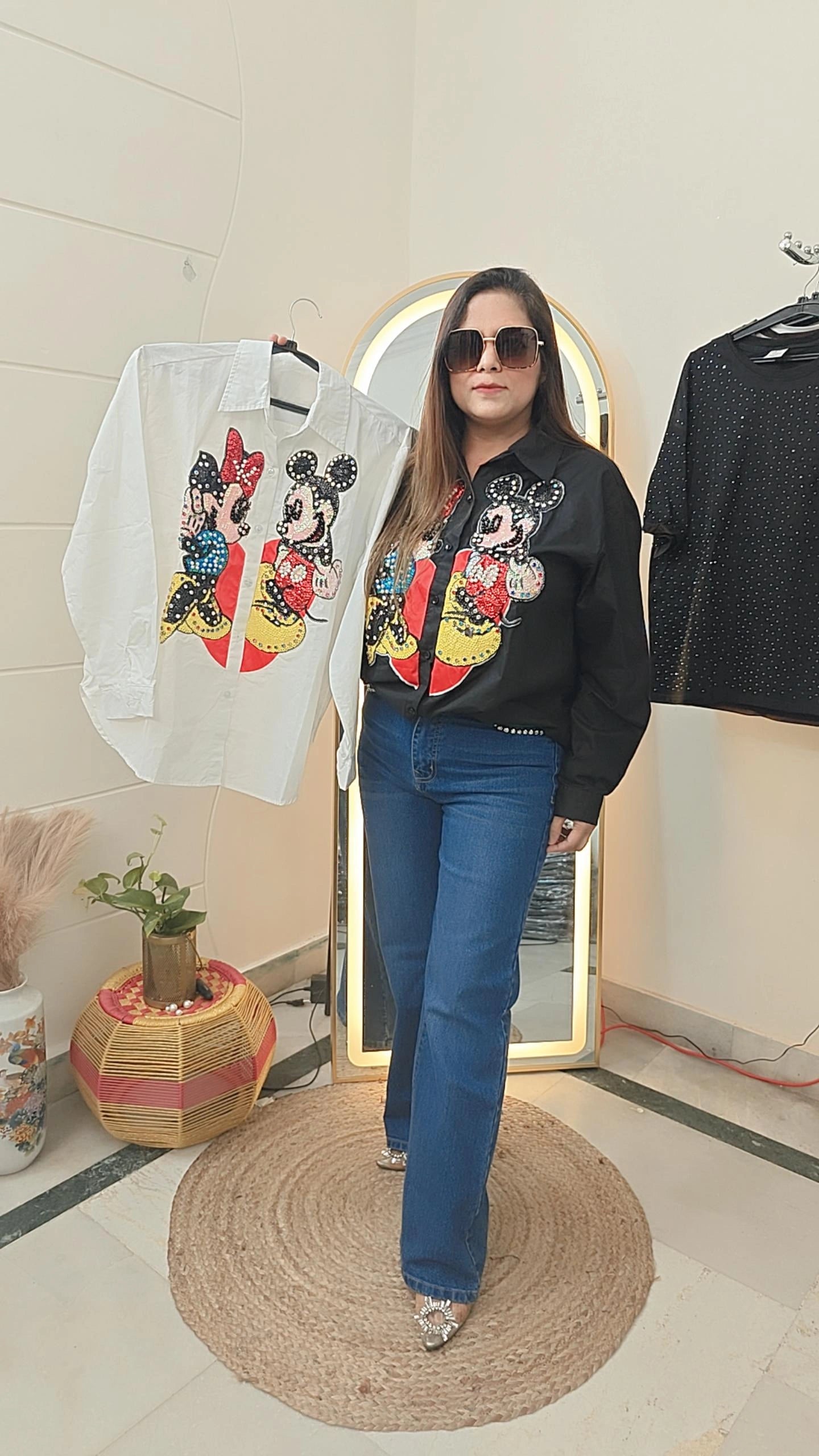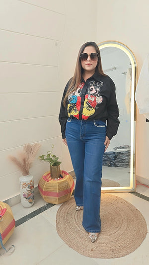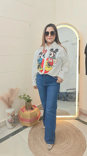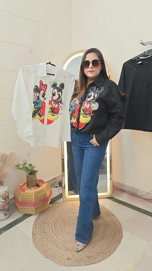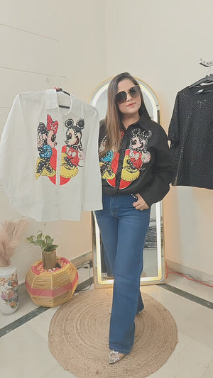 Experience the love between Mickey and Minnie with this sparkling shirt. The iconic duo is adorned with shimmering details, adding a touch of glamour to your wardrobe. Show off your love for Disney while looking stylish and chic. Perfect for any Disney fan or lover of adorable cartoon couples.