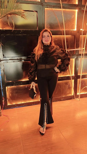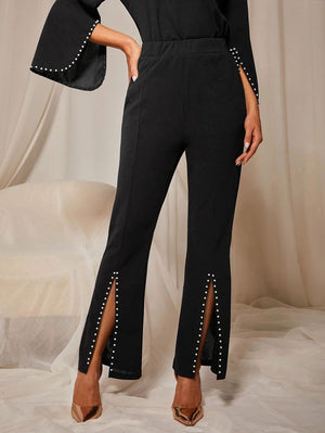 Modely Pearls Beaded Split Hem Flare Leg Pants - Black