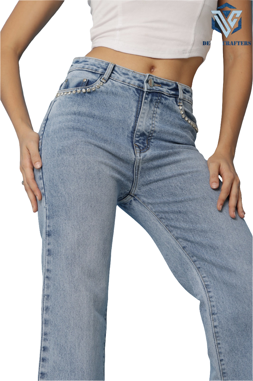 "Get the perfect fit and style with our Pearl Pocket Straight Fit Denims. Designed to flatter your figure, these denims feature a straight fit and a convenient pearl pocket for a touch of elegance. Look and feel confident in these versatile jeans."