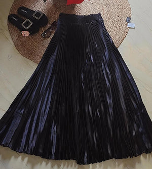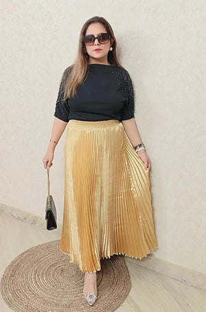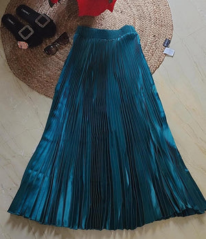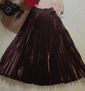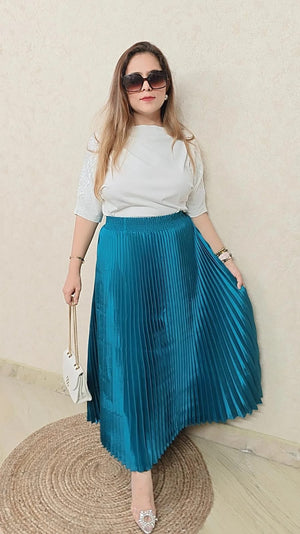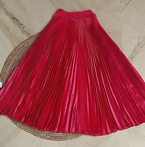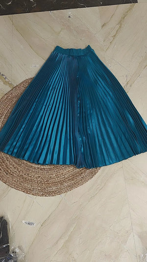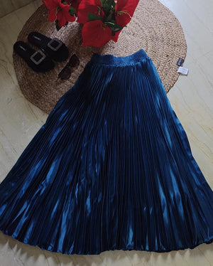 Experience ultimate comfort and style with our imported premium pleated skirt. The long length provides a modern look, while the inner attached free size ensures a perfect fit for all body types. Upgrade your wardrobe with this versatile and chic piece.