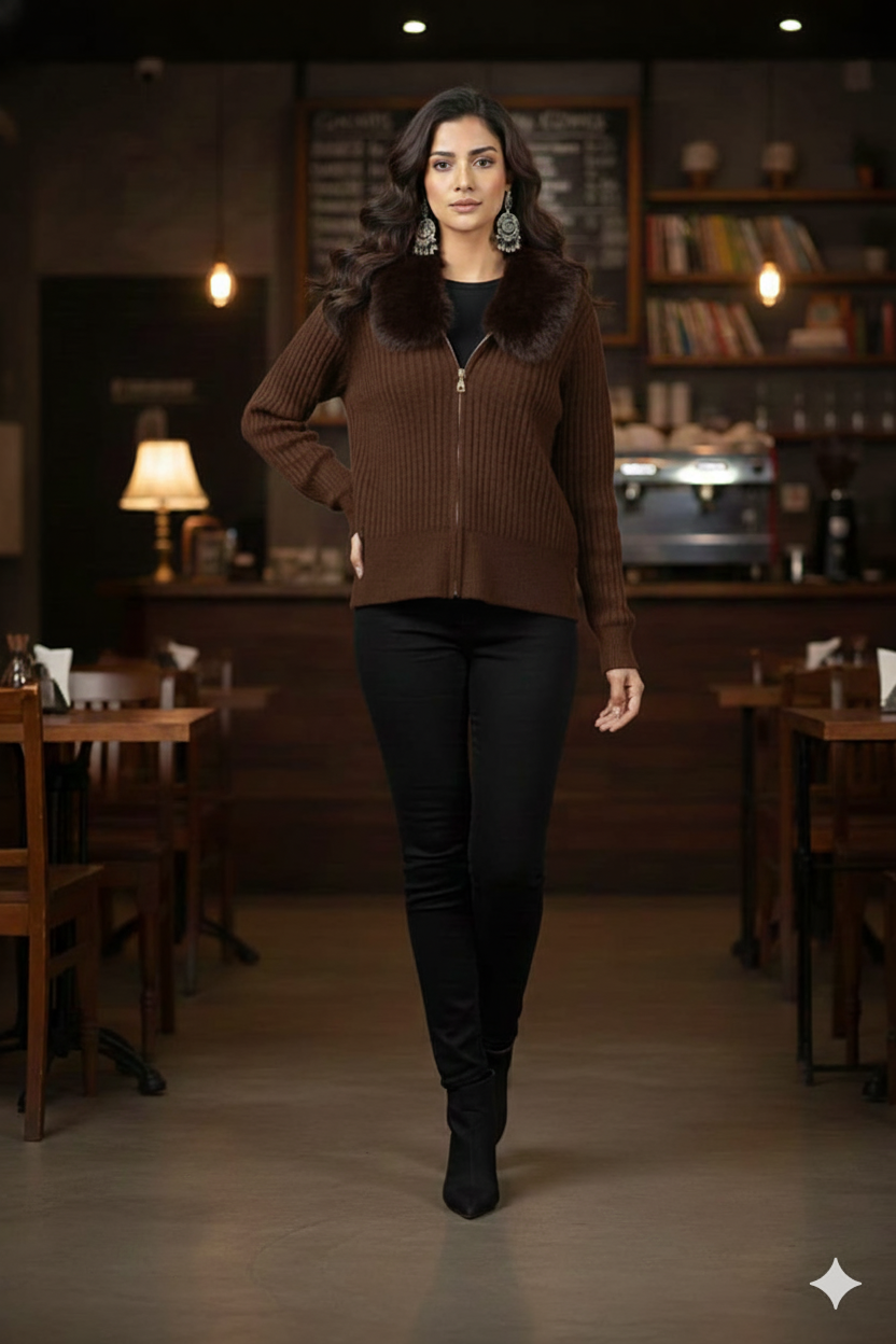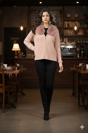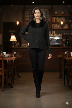 Expertly crafted with a zipper for ease of wear and a stylish look. The Rib Fur Collar Zipper Cardigan adds a touch of luxury to any outfit. Perfect for those looking for comfort and fashion in one versatile piece.