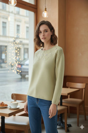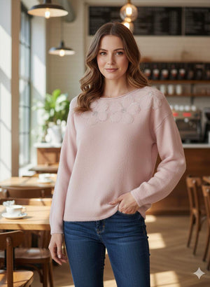 Home Round-Neck Knit Top with Shoulder Flower Detail