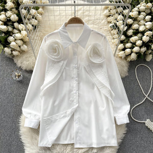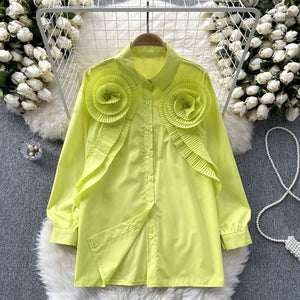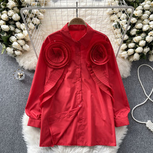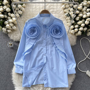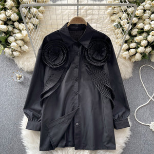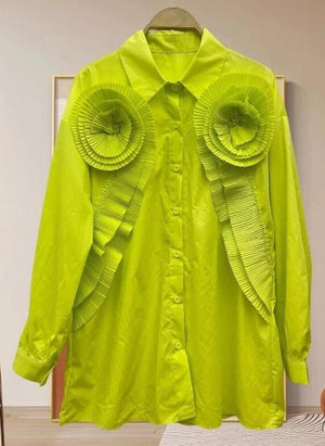 This Ruffle Designer shirt features a unique flower design on both sides, adding a touch of elegance to any outfit. Made with high-quality materials, this designer shirt is perfect for those looking for a stylish and sophisticated look. Elevate your wardrobe with this must-have piece.