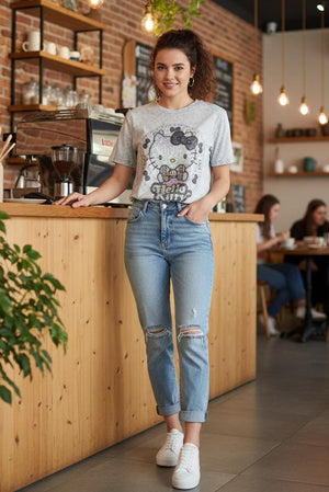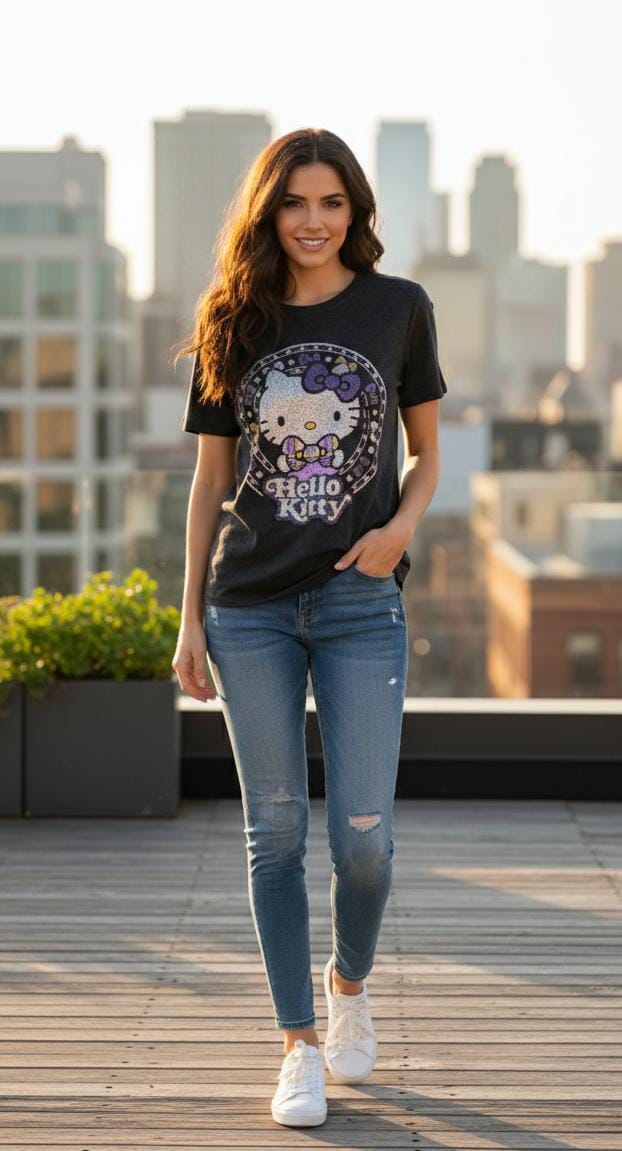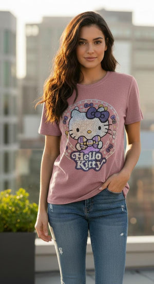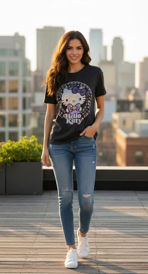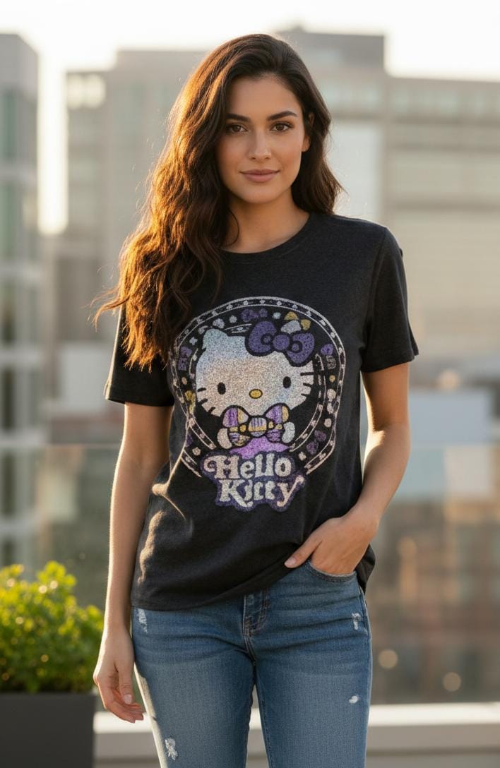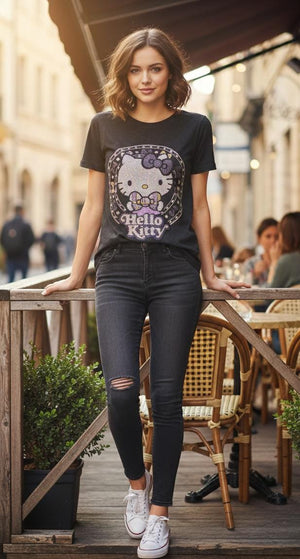 Elevate your casual wardrobe with this eye-catching Hello Kitty tee featuring shimmering embellishments that capture light beautifully. The iconic character design combines nostalgic charm with contemporary sparkle, making it perfect for fans who want to express their personality with style. Crafted for comfort and durability, this versatile piece works equally well for everyday wear or as a standout addition to themed outfits. The quality bling detailing ensures long-lasting brilliance wash after wash.