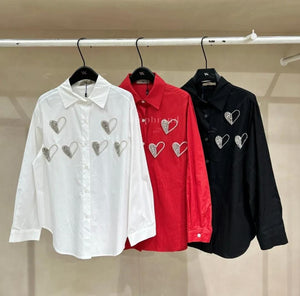 Add an elegant touch to your wardrobe with these Statement Shirts featuring a heart made of glimmering rhinestones. Perfect for expressing your unique style, these shirts are the perfect combination of fashion and sophistication. Upgrade your look with a touch of bling and make a statement wherever you go.