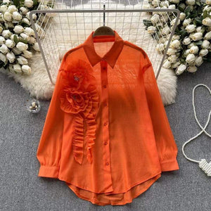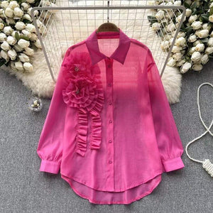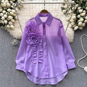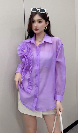 Elevate your style with this elegant Organza side flower top. The lightweight, sheer fabric is adorned with delicate flowers, while the inner lining provides comfort and coverage. Perfect for any occasion, this top adds a touch of sophistication and femininity to any outfit.