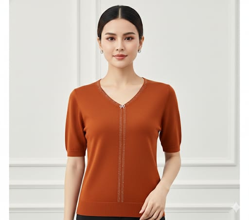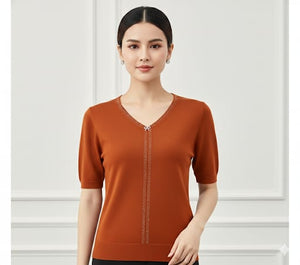 Elevate your everyday wardrobe with this sophisticated V-neck knit top, designed for those who appreciate refined details. The luxurious knit fabric offers comfort and breathability, while delicate rhinestone trim along the neckline adds a touch of glamour. A char