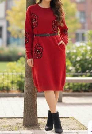 Winter Embroidered Sweater Dress with Belt Elevate your cold-weather wardrobe with this sophisticated sweater dress, crafted for both comfort and refined style. The intricate embroidery detailing adds an artisanal touch that distinguishes it from basic knits, while the included belt allows you to define your silhouette and transition seamlessly from casual to polished occasions. Constructed from quality knit fabric, this piece provides the warmth necessary for winter months without compromising on elegance. The versatile design pairs effortlessly with boots, tights, or layered accessories, making it a practical investment for your seasonal collection.
