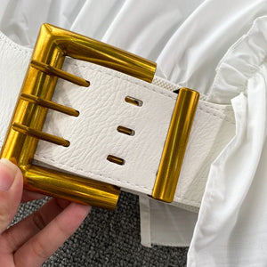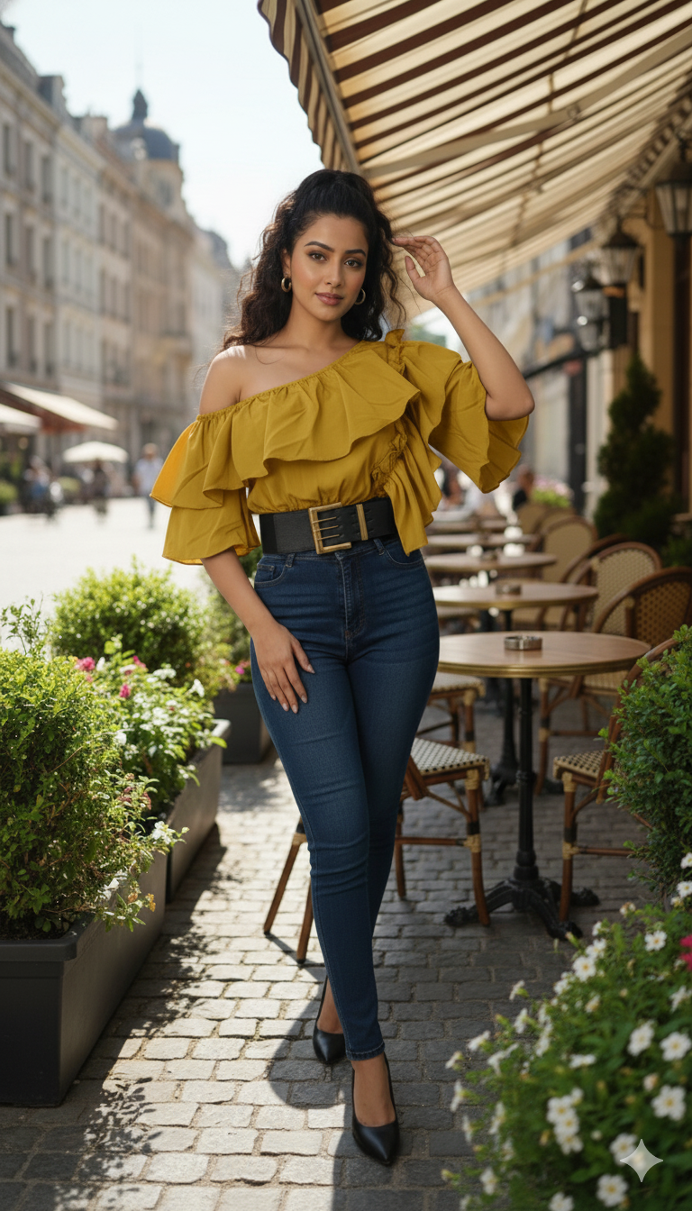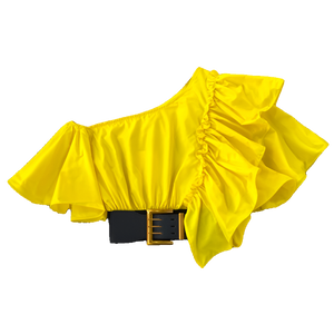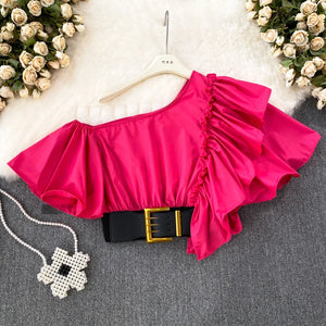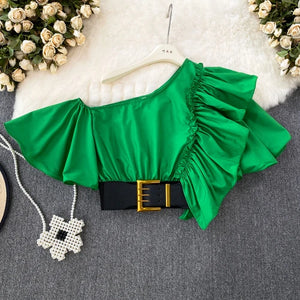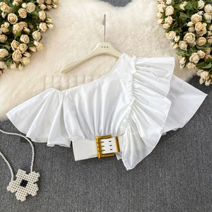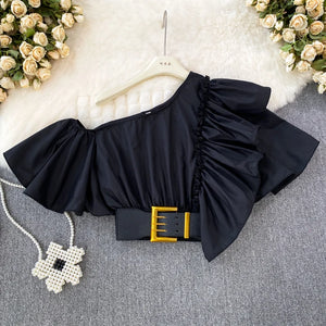 Women Puff Off Shoulder Ruffles Blouse with Belts, Women's Blouse Chic Cropped top