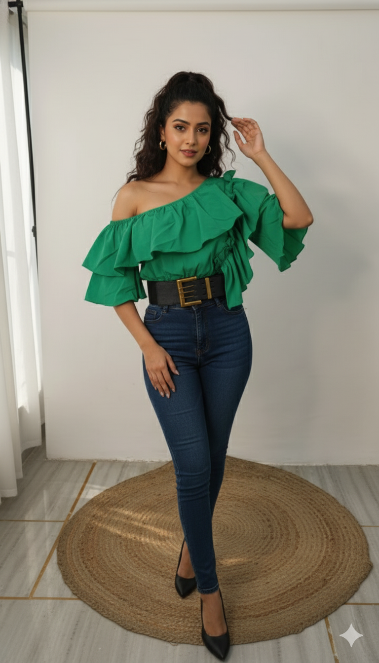 Elevate your style with this chic and cropped Women Puff Off Shoulder Ruffles Blouse. Featuring a ruffled neckline and belted waist, this blouse adds a touch of elegance to any outfit. The off-shoulder design is perfect for showcasing your shoulders, while the cropped length adds a modern twist.