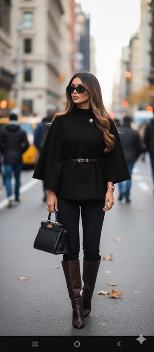 Elevate your winter wardrobe with this sophisticated wool cape paired with commanding tall boots. The cape's luxurious wool construction provides exceptional warmth and timeless elegance, draping gracefully over your silhouette. The coordinating tall boots extend your line and deliver both comfort and polished style for any occasion. This curated set combines classic tailoring with modern sensibility, making it an essential investment for those who appreciate refined fashion. Perfect for layering over dresses or casual wear, this ensemble transitions seamlessly from day to evening.