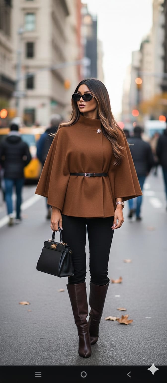 wool cape with tall boots